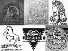 | A. B. Salmen Successors Ltd Pharoah Brand Invica Brand Master Brand | A. B. Salmen | 1850 | Londýn Sheffield | Anglie | 1967 | ![]() | hlava faraona, losos v kruhu s písmenem S, vzpínající se kůň, text: PHAROAH BRAND, SHEFFIELD, REGISTERED, SALMEN, INVICA, MASTER | hoblíky a další truhlářské nářadí | 1926 - firmu kupuje R. Waxman 1937 firma získává ochr. známku Charles Nurse & Co 1967 - ukončení výroby hoblíků | |||