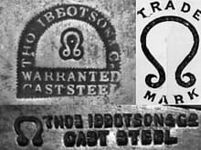 | Thos Ibbotson & Co | Thomas Ibbotson | 1814 | Sheffield | Anglie | 1905 | ![]() | omega, jho, text:THOS IBBOTSON & CO, CASTSTEEL, WARANTED | hoblíky, dláta, nože, pily a další řezné nástroje. | Tato firma zapsaná v roce 1822, prodávala řezné nářadí, zejména truhlářské hoblíky. Její zakladatel Thomas Ibbotson (asi 1788-1871) byl také obchodníkem a "výrobcem" stolních nožů, který vyráběl nože Bowie. V roce 1859 odešel do důchodu a zemřel 21. ledna 1871 ve věku 83 let v Alma Vale Cottage v Ecclesallu. Byl pohřben v Ecclesallu a zanechal po sobě necelých 3 000 liber. Jeho synové - Thomas (asi 1813-1883), William (asi 1818-1895) a Peter Frith (1834-1905) - se stali společníky ve firmě, která v roce 1871 zaměstnávala sto dělníků. V roce 1905 odkoupila majetek firmy Ibbotson společnost William Marples & Sons Ltd. Gee & Holmes později vlastnila název. | |||