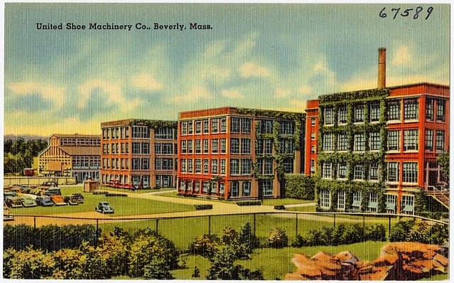 Společnost United Shoe Machinery Company vznikla sloučením tří konkurenčních firem vyrábějících obuvnické stroje v roce 1899. V roce 1903 zahájila výstavbu nové továrny v Beverly ve státě Massachusetts, nedaleko Bostonu. Její korporátní ředitelství bylo nakonec přemístěno do Bostonu s klíčovými výrobními provozy roztroušenými po celém Massachusetts. Později měli i dceřiné společnosti v jiných zemích, včetně British United Shoe Machinery v Anglii. Na svém vrcholu tato společnost zaměstnávala 9 000 zaměstnanců a vyráběla 85% všech obuvnických strojů ve Spojených státech.