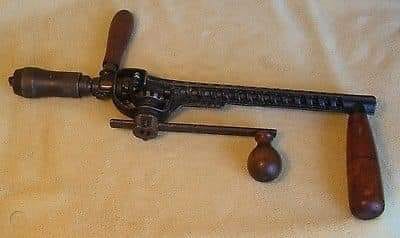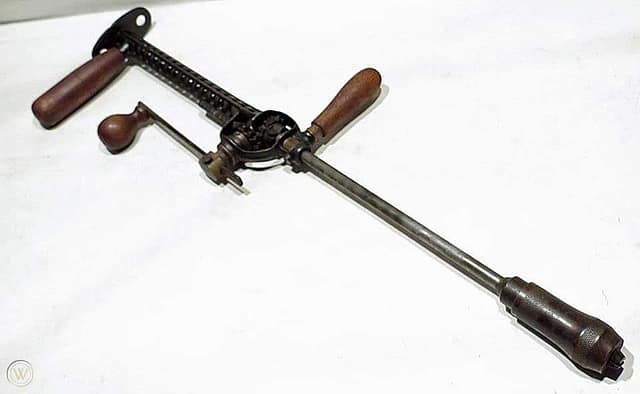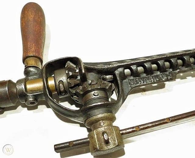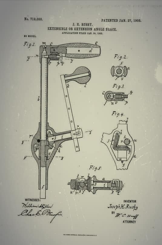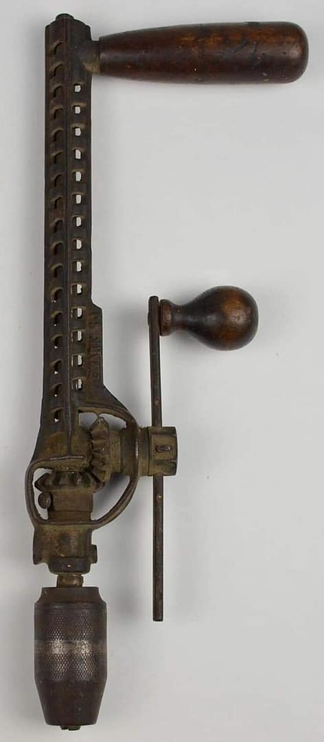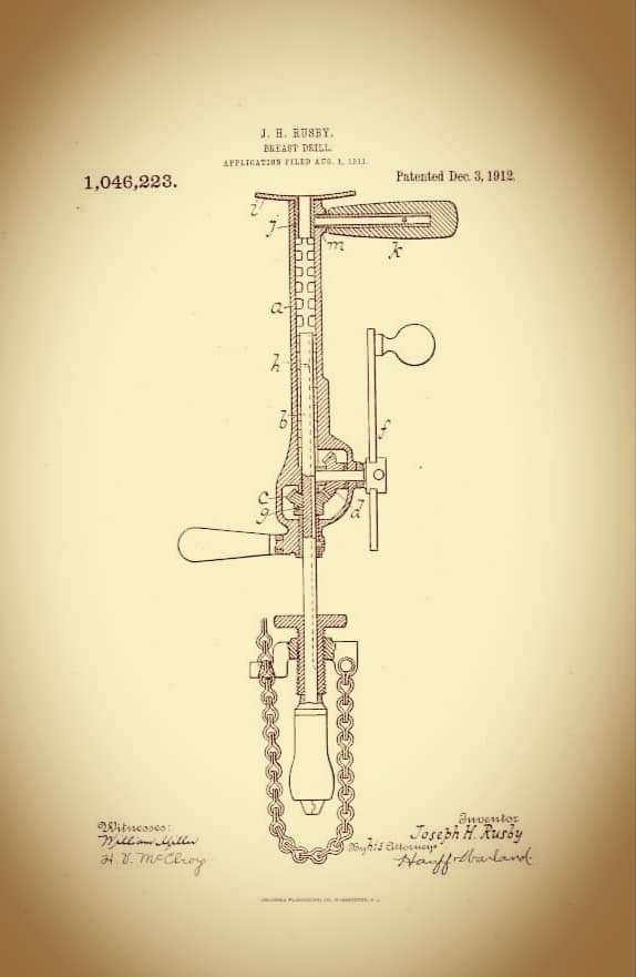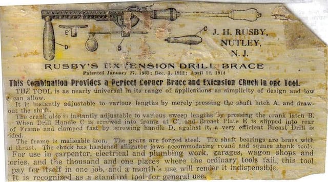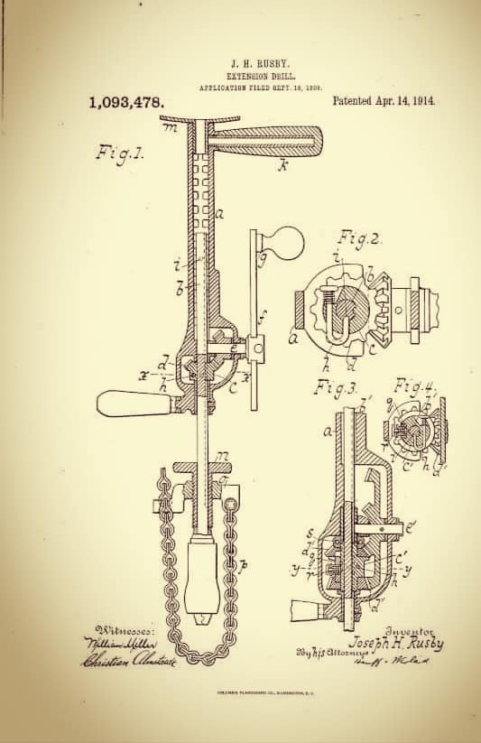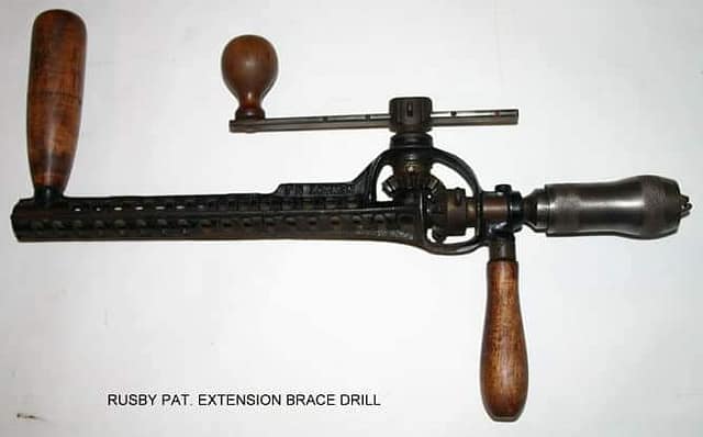 Patentovaná kliková vrtačka Josepha Hurd Rusbyho. Tento velice zajímavý nastoj, patentovany pod číslem 1,046.223 z roku 1912, má několik technických zajímavostí. Dominantní je zejména výsuvná hřídel, která zvětší dosah vrtáku o více než 24cm (9½“). Pak je tu klička s nastavitelnou pákou, díky které je možné pracovat snadněji s větší silou, například u větších průměrů děr, nebo u houževnatějších materiálů. Oproti předchozímu patentu vrtačky od stejného autora z roku 1903 (pat. 719.050), má tento kus navíc odnímatelná madla – původní je měla lité v jednom kuse.