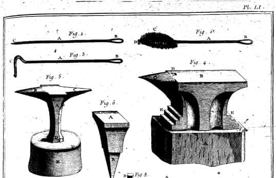Tyto kovadliny byly typické svým robustním tělem se zdobeným čelem a dvojitým obloukem pod ním. Centrální sloup u nich zpravidla přecházel ve stupňovitou základnu. Obdélníková pracovní deska, obvykle končící na jedné nebo obou stranách kulatým rohem, ale v tomto případě je deska obdélníková a roh se nachází na zadní straně. Na prsou kovadliny je letopočet 1793 a signatura výrobce. Sofistikovaný design tohoto nástroje připomíná tvary středověkých katedrál a je zároveň je velmi kvalitní a pevný.